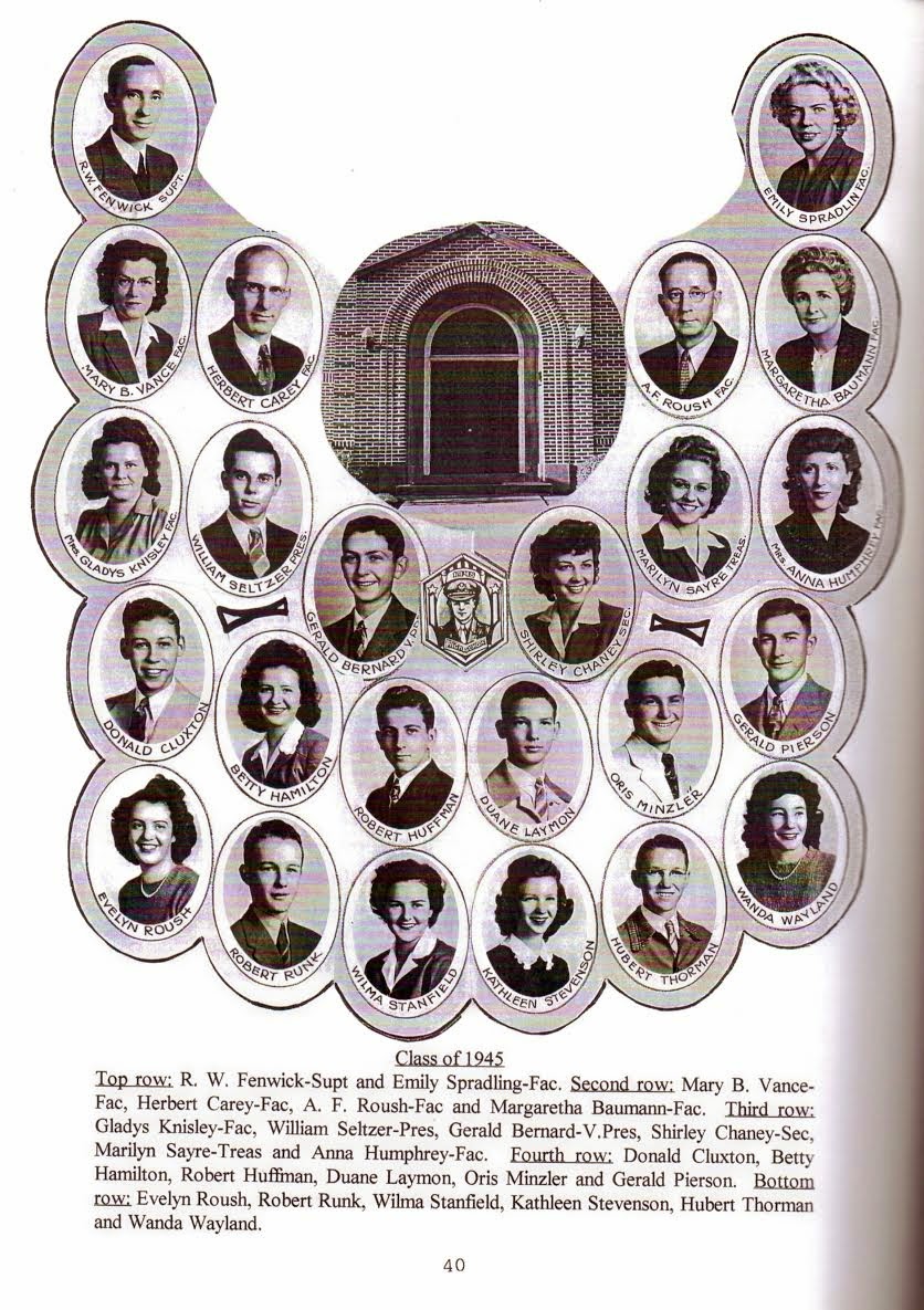 The NVHS Class of 1945 photo includes pictures of the faculty and many familiar faces. Sixteen graduates and eight faculty are pictured.