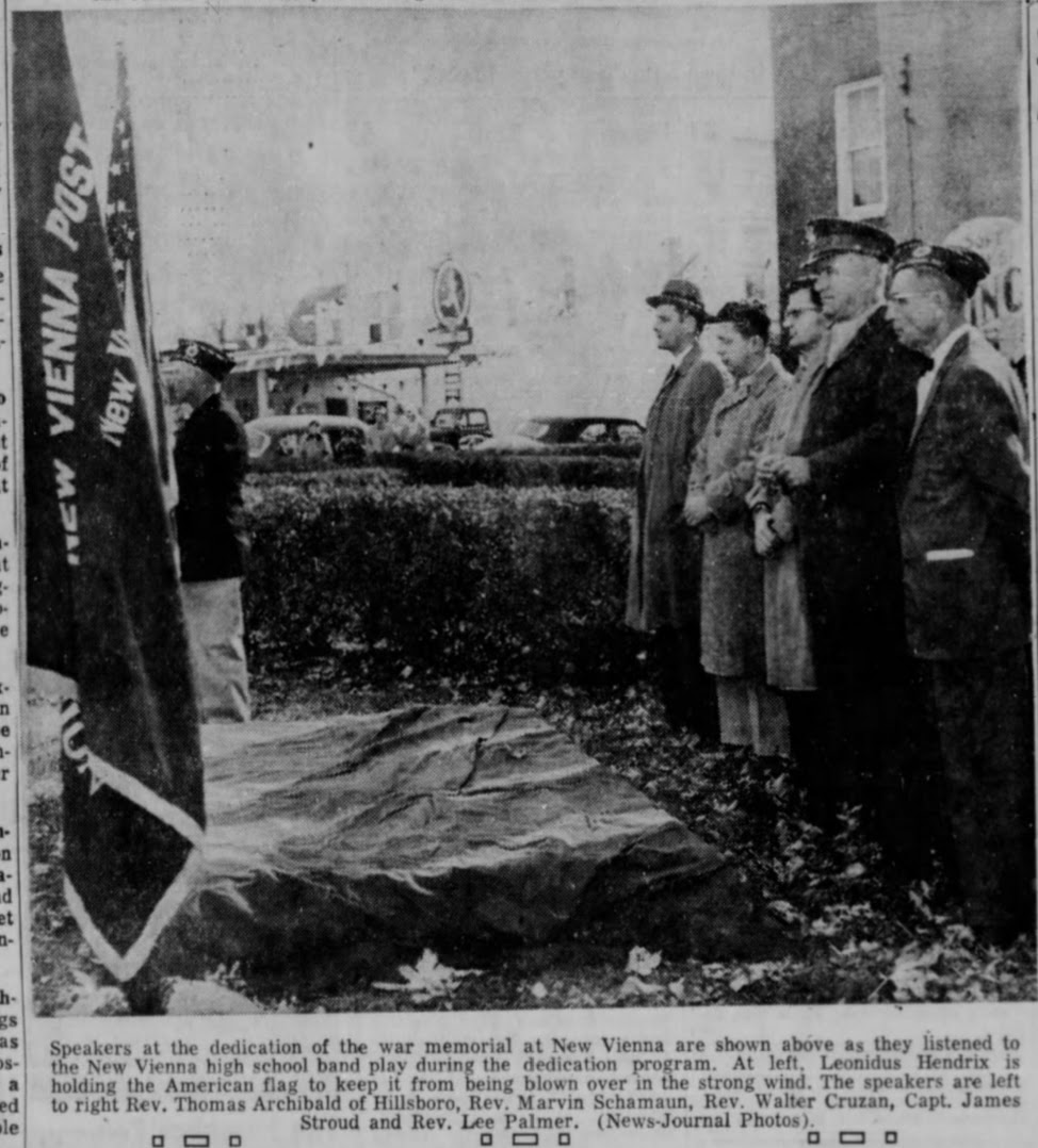 Veterans Day in 1955 was the dedication of a new war memorial in the New Vienna park on the corner of Main and West Streets. According to the accompanying news article published in the Wilmington News-Journal, Nov. 12, p. 10, a brief ceremony on Friday afternoon was attended by about 125 persons. The high school band, directed by Mrs. Carl West, performed. Rev. Walter Cruzan (NV Church of Christ), Rev. Marvin Schamaun (NV Methodist) and Rev. Lee Palmer (?) were among the speakers.